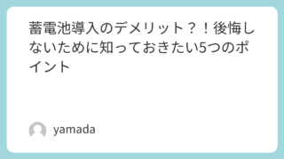 ブログ 蓄電池導入のデメリット?!後悔しないために知っておきたい5つのポイント 電気代高騰や停電対策の文脈で注目される蓄電池。メリットばかりが語られがちですが、導入後の“ギャップ”を避けるには、デメリットの正しい理解が欠かせません。本記事では、家庭の導入検討者向けに、判断材料をやさしく整理します。「もしもの停電に備えた... 2025.09.12 ブログ